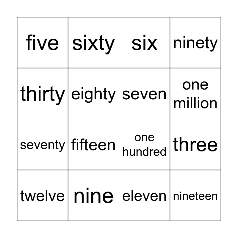 This bingo card has 31 words: one, two, three, four, five, six, seven, eight, nine, ten, eleven, twelve, thirteen, fourteen, fifteen, sixteen, seventeen, eighteen, nineteen, twenty, thirty, forty, fifty, sixty, seventy, eighty, ninety, one hundred, one thousand, one million and one billion.