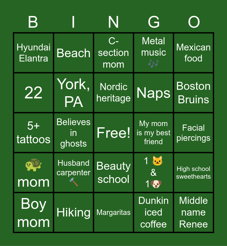 This bingo card has a free space and 24 words: Boy mom, Husband carpenter🔨, Nordic heritage, Dunkin iced coffee, Mexican food, Hyundai Elantra, Beach, C-section mom, My mom is my best friend, Facial piercings, 5+ tattoos, York, PA, 1 🐱 & 1🐶, High school sweethearts, 22, Hiking, Margaritas, Metal music 🎶, Boston Bruins, 🐢 mom, Believes in ghosts, Beauty school, Naps and Middle name Renee.