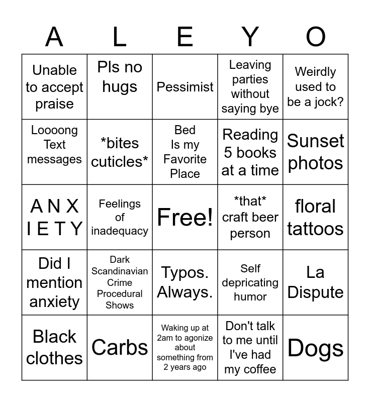 This bingo card has a free space and 24 words: Dark Scandinavian Crime Procedural Shows, Carbs, Bed Is my Favorite Place, Black clothes, Weirdly used to be a jock?, Unable to accept praise, Loooong Text messages, Pls no hugs, *that* craft beer person, Typos. Always., Reading 5 books at a time, A N X I E T Y, Self depricating humor, La Dispute, *bites cuticles*, Don't talk to me until I've had my coffee, floral tattoos, Pessimist, Sunset photos, Feelings of inadequacy, Dogs, Did I mention anxiety, Leaving parties without saying bye and Waking up at 2am to agonize about something from 2 years ago.