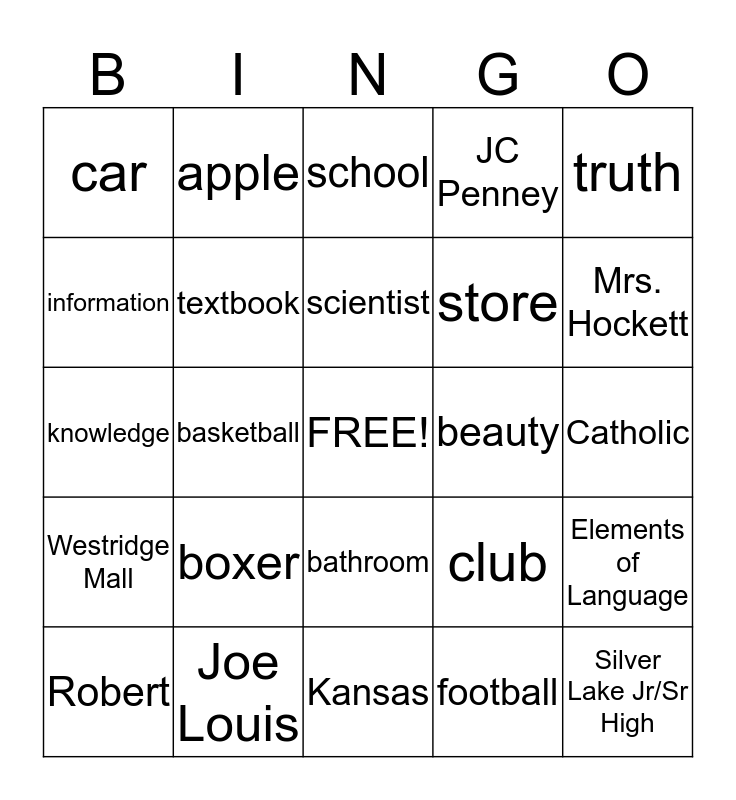 This bingo card has a free space and 45 words: dog, Silver Lake Jr/Sr High, firehouse, Robert, team, football, school, English class, truth, Joe Louis, JC Penney, beauty, bathroom, boxer, crew, Kansas, teacher, knowledge, education, Mrs. Hockett, apple, painting, clock, car, singer, Catholic, book, Albert Einstein, club, Westridge Mall, main character, Elements of Language, movie, bologna, church, basketball, family, calculator, origami, scientist, information, store, World War II, textbook and treehouse.