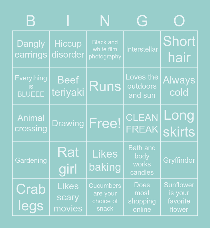 This bingo card has a free space and 24 words: Rat girl, Likes scary movies, Runs, Crab legs, Short hair, Dangly earrings, Everything is BLUEEE, Hiccup disorder, CLEAN FREAK, Likes baking, Loves the outdoors and sun, Animal crossing, Bath and body works candles, Gryffindor, Beef teriyaki, Does most shopping online, Long skirts, Black and white film photography, Always cold, Drawing, Sunflower is your favorite flower, Gardening, Interstellar and Cucumbers are your choice of snack.