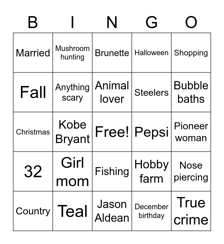 This bingo card has a free space and 24 words: Girl mom, Teal, Animal lover, Country, Shopping, Married, Fall, Mushroom hunting, Pepsi, Fishing, Steelers, Christmas, Hobby farm, Nose piercing, Anything scary, December birthday, Pioneer woman, Brunette, Bubble baths, Kobe Bryant, True crime, 32, Halloween and Jason Aldean.