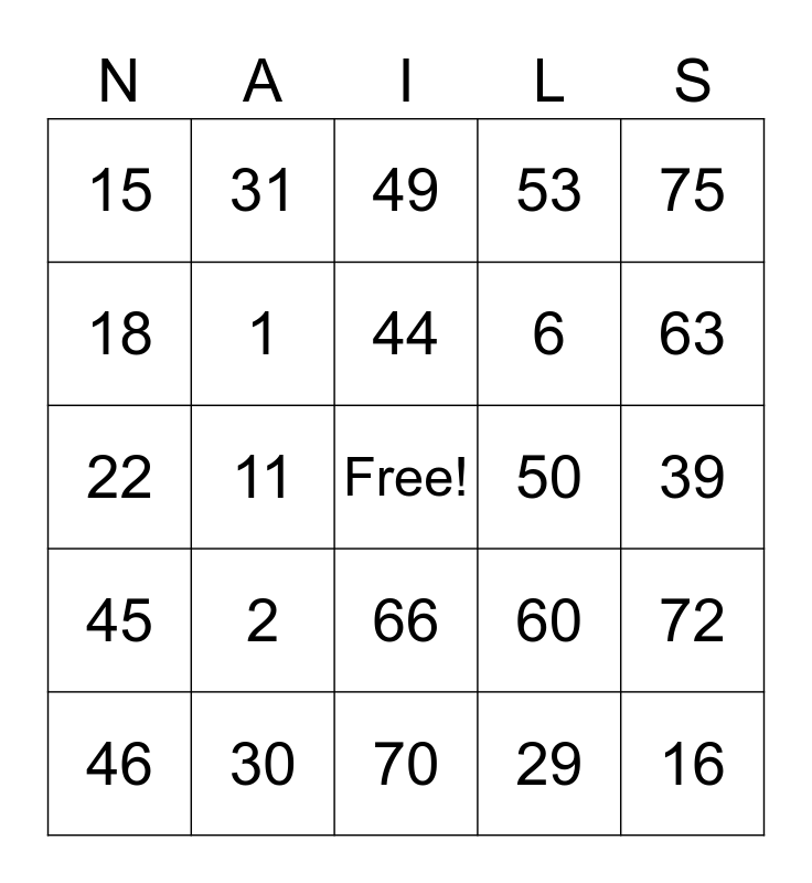 This bingo card has a free space and 24 words: 2, 30, 44, 46, 75, 15, 18, 31, 50, 66, 6, 22, 60, 72, 1, 29, 39, 49, 63, 11, 16, 45, 53 and 70.
