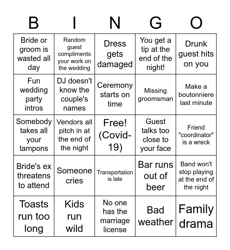This bingo card has a free space and 24 words: Someone cries, Kids run wild, Ceremony starts on time, Toasts run too long, Drunk guest hits on you, Bride or groom is wasted all day, Fun wedding party intros, Random guest compliments your work on the wedding, Guest talks too close to your face, Transportation is late, Missing groomsman, Somebody takes all your tampons, Bar runs out of beer, Band won't stop playing at the end of the night, DJ doesn't know the couple's names, Bad weather, Friend "coordinator" is a wreck, Dress gets damaged, Make a boutonniere last minute, Vendors all pitch in at the end of the night, Family drama, Bride's ex threatens to attend, You get a tip at the end of the night! and No one has the marriage license.