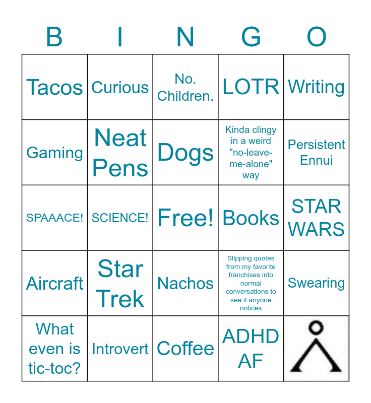 This bingo card has 1 images, a free space and 23 words: Star Trek, Introvert, Dogs, What even is tic-toc?, Writing, Tacos, Gaming, Curious, Books, Nachos, Kinda clingy in a weird "no-leave-me-alone" way, SPAAACE!, Slipping quotes from my favorite franchises into normal conversations to see if anyone notices, Swearing, Neat Pens, ADHD AF, STAR WARS, No. Children., Persistent Ennui, SCIENCE!, Aircraft, LOTR and Coffee.