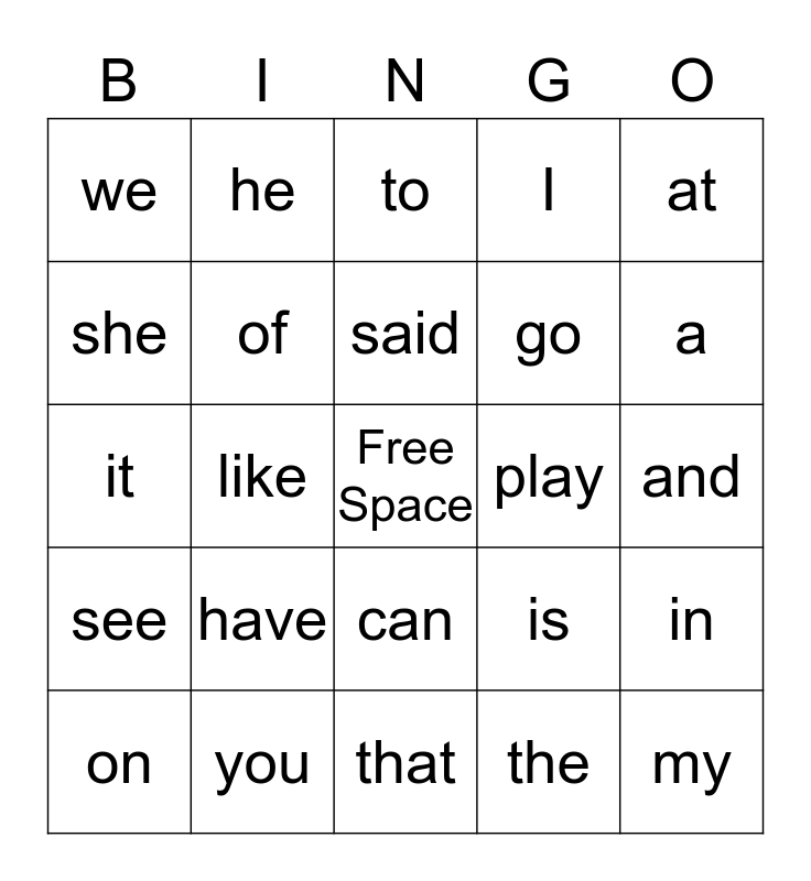 This bingo card has a free space and 24 words: have, you, said, on, at, we, she, he, play, can, go, it, is, in, of, the, and, to, a, like, my, see, I and that.