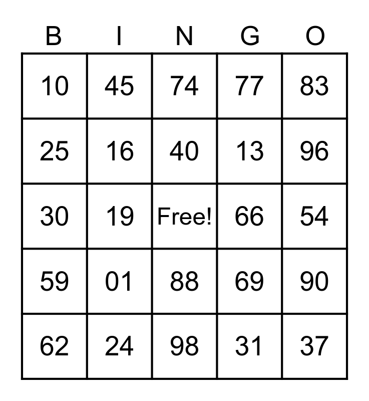 This bingo card has a free space and 24 words: 01, 24, 40, 62, 83, 10, 25, 45, 66, 88, 13, 30, 69, 90, 16, 31, 54, 74, 96, 19, 37, 59, 77 and 98.