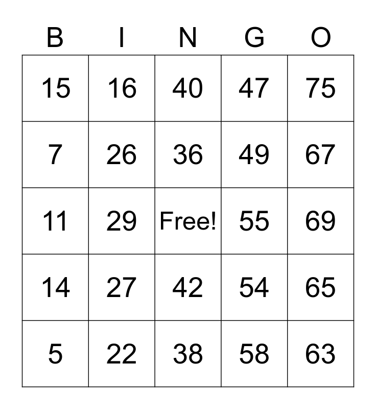This bingo card has a free space and 24 words: 5, 27, 36, 58, 75, 15, 16, 40, 55, 69, 11, 26, 54, 65, 7, 22, 38, 47, 67, 14, 29, 42, 49 and 63.