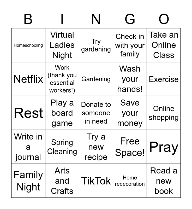 This bingo card has 25 words: Spring Cleaning, TikTok, Gardening, Family Night, Take an Online Class, Homeschooling, Netflix, Virtual Ladies Night, Save your money, Try a new recipe, Wash your hands!, Rest, Free Space!, Pray, Work (thank you essential workers!), Read a new book, Online shopping, Try gardening, Exercise, Play a board game, Donate to someone in need, Arts and Crafts, Write in a journal, Check in with your family and Home redecoration.
