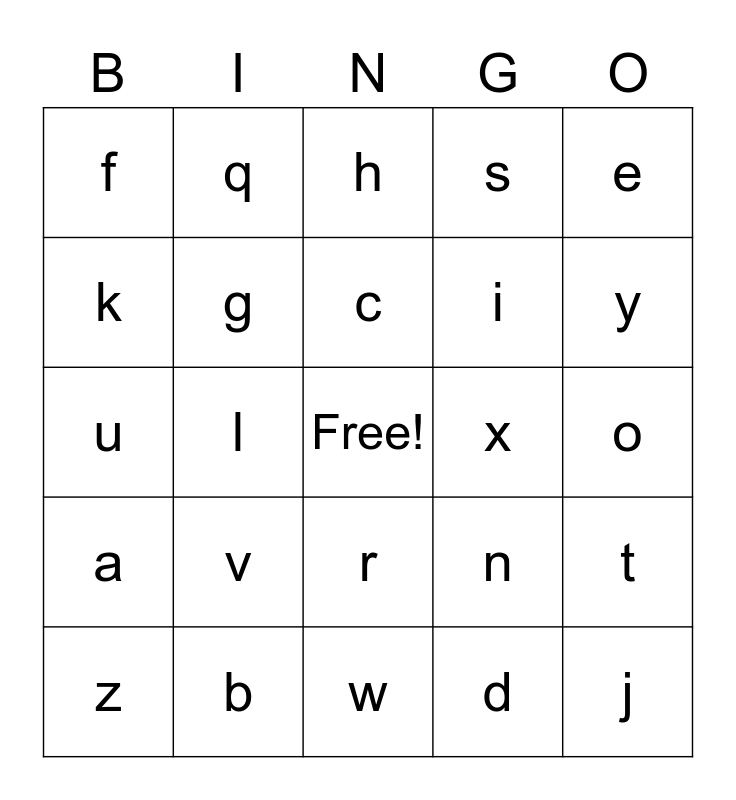 This bingo card has a free space and 26 words: a, b, c, d, e, f, g, h, i, j, k, l, m, n, o, p, q, r, s, t, u, v, w, x, y and z.