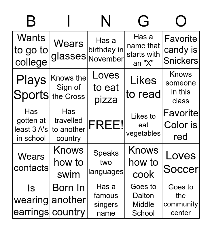 This bingo card has a free space and 24 words: Knows how to swim, Born In another country, Loves to eat pizza, Is wearing earrings, Favorite candy is Snickers, Wants to go to college, Plays Sports, Wears glasses, Likes to eat vegetables, Speaks two languages, Likes to read, Has gotten at least 3 A's in school, Knows how to cook, Loves Soccer, Knows the Sign of the Cross, Goes to Dalton Middle School, Favorite Color is red, Has a birthday in November, Knows someone in this class, Has travelled to another country, Goes to the community center, Wears contacts, Has a name that starts with an "X" and Has a famous singers name.