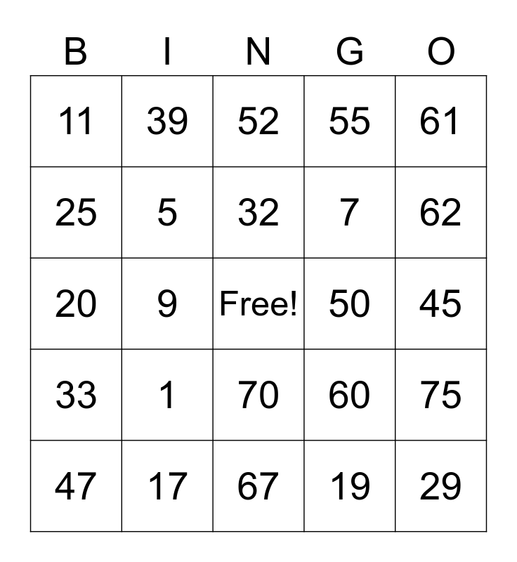 This bingo card has a free space and 24 words: 1, 17, 32, 47, 61, 11, 25, 39, 50, 70, 7, 20, 60, 75, 5, 19, 45, 52, 62, 9, 29, 33, 55 and 67.