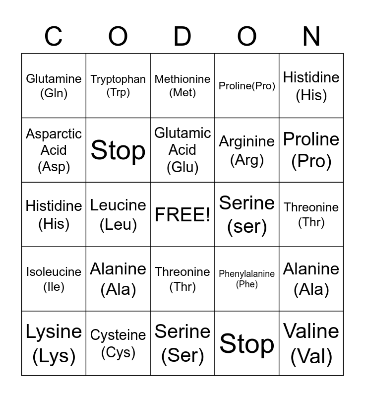 Codon Bingo | Codon Bingo | Codon Bingo | CODON BINGO! | CODON BINGO!