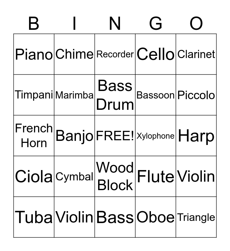 This bingo card has a free space and 24 words: Cymbal, Violin, Bass Drum, Tuba, Clarinet, Piano, Timpani, Chime, Xylophone, Wood Block, Bassoon, French Horn, Flute, Violin, Marimba, Oboe, Harp, Recorder, Piccolo, Banjo, Triangle, Ciola, Cello and Bass.