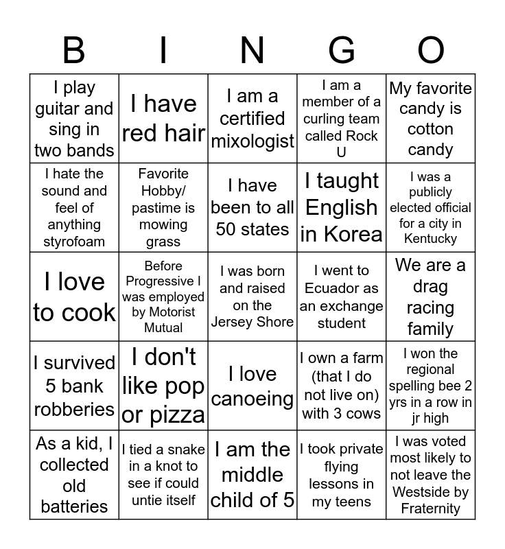 This bingo card has a free space and 24 words: I don't like pop or pizza, I tied a snake in a knot to see if could untie itself, I have been to all 50 states, As a kid, I collected old batteries, My favorite candy is cotton candy, I play guitar and sing in two bands, I hate the sound and feel of anything styrofoam, I have red hair, I went to Ecuador as an exchange student, I love canoeing, I taught English in Korea, I love to cook, I own a farm (that I do not live on) with 3 cows, I won the regional spelling bee 2 yrs in a row in jr high, Favorite Hobby/ pastime is mowing grass, I took private flying lessons in my teens, We are a drag racing family, I am a certified mixologist, I was a publicly elected official for a city in Kentucky, Before Progressive I was employed by Motorist Mutual, I was voted most likely to not leave the Westside by Fraternity, I survived 5 bank robberies, I am a member of a curling team called Rock U and I am the middle child of 5.