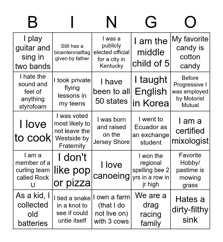 This bingo card has a free space and 24 words: I don't like pop or pizza, I tied a snake in a knot to see if could untie itself, I have been to all 50 states, As a kid, I collected old batteries, My favorite candy is cotton candy, I play guitar and sing in two bands, I hate the sound and feel of anything styrofoam, Still has a bicentennialflag given by father, I went to Ecuador as an exchange student, I love canoeing, I taught English in Korea, I love to cook, I won the regional spelling bee 2 yrs in a row in jr high, Favorite Hobby/ pastime is mowing grass, I took private flying lessons in my teens, We are a drag racing family, I am a certified mixologist, I was a publicly elected official for a city in Kentucky, Before Progressive I was employed by Motorist Mutual, I was voted most likely to not leave the Westside by Fraternity, Hates a dirty-filthy sink, I am a member of a curling team called Rock U, I am the middle child of 5 and I own a farm (that I do not live on) with 3 cows.