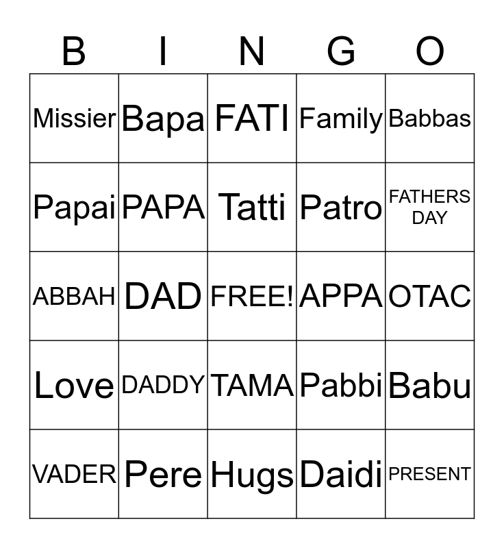 This bingo card has a free space and 24 words: DADDY, Pere, Tatti, VADER, Babbas, Missier, Papai, Bapa, APPA, TAMA, Patro, ABBAH, Pabbi, Babu, PAPA, Daidi, OTAC, FATI, FATHERS DAY, DAD, PRESENT, Love, Family and Hugs.