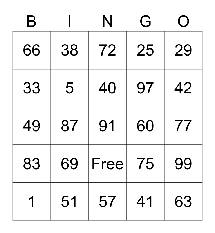 This bingo card has 26 words: Free, 1, 5, 13, 25, 29, 33, 38, 40, 41, 42, 49, 51, 57, 60, 63, 66, 69, 72, 75, 77, 83, 87, 91, 97 and 99.