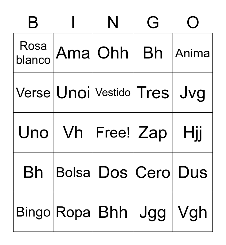 This bingo card has a free space and 24 words: Bolsa, Ropa, Vestido, Bingo, Anima, Rosa blanco, Verse, Ama, Zap, Dos, Tres, Uno, Cero, Dus, Unoi, Jgg, Hjj, Ohh, Jvg, Vh, Vgh, Bh, Bh and Bhh.
