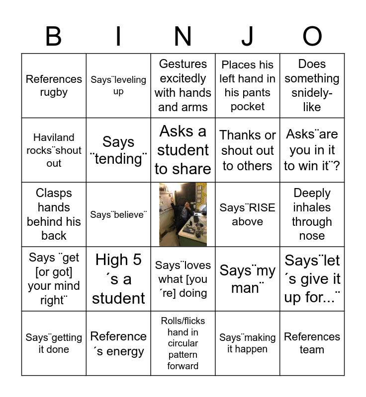 This bingo card has a free space and 24 words: Says¨getting it done, High 5´s a student, Asks a student to share, Says¨making it happen, Does something snidely- like, References rugby, Says¨leveling up, Gestures excitedly with hands and arms, Says¨RISE above, Deeply inhales through nose, Clasps hands behind his back, Says ¨tending¨, Says¨my man¨, Says¨let´s give it up for...¨, Haviland rocks¨shout out, Reference´s energy, Rolls/flicks hand in circular pattern forward, Places his left hand in his pants pocket, Asks¨are you in it to win it¨?, Says ¨get [or got] your mind right¨, Says¨believe¨, Says¨loves what [you´re] doing, Thanks or shout out to others and References team.