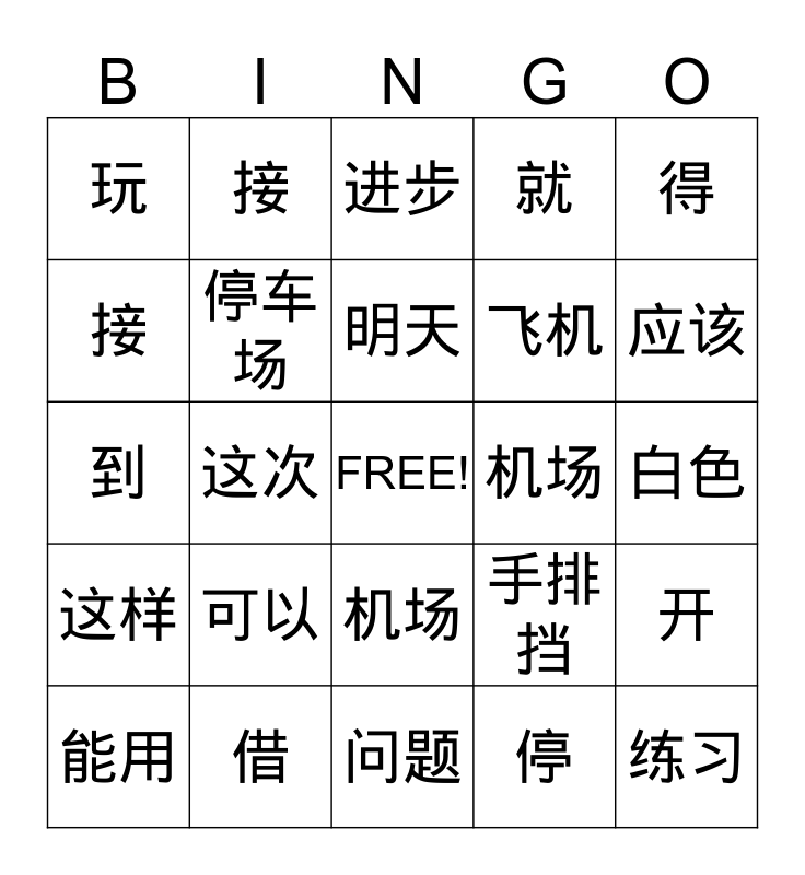 This bingo card has a free space and 24 words: 可以, 借, 明天, 能用, 得, 玩, 接, 接, 机场, 机场, 飞机, 到, 手排挡, 开, 停车场, 停, 白色, 进步, 应该, 这次, 练习, 这样, 就 and 问题.