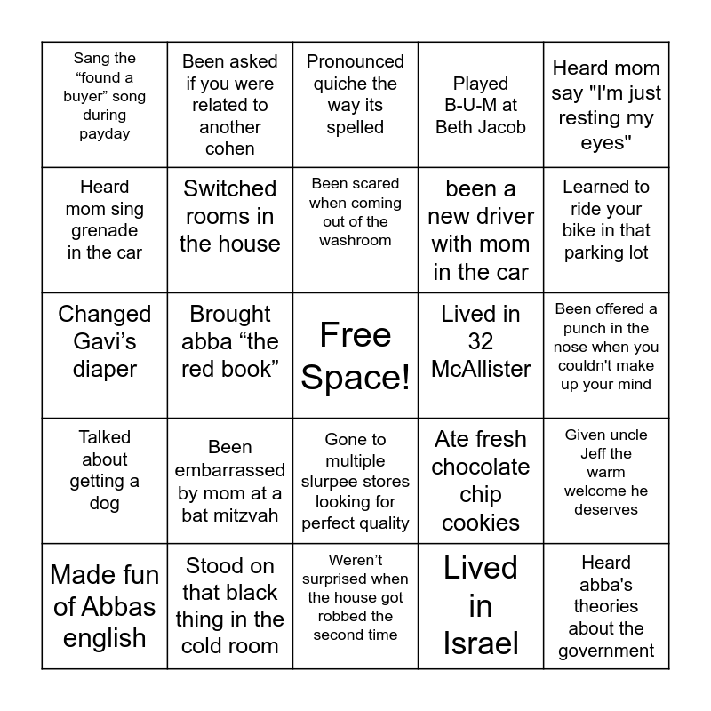 This bingo card has a free space and 24 words: Made fun of Abbas english, Been embarrassed by mom at a bat mitzvah, Been scared when coming out of the washroom, Lived in Israel, Heard mom say "I'm just resting my eyes", Sang the “found a buyer” song during payday, Been asked if you were related to another cohen, Pronounced quiche the way its spelled, Lived in 32 McAllister, Been offered a punch in the nose when you couldn't make up your mind, Changed Gavi’s diaper, Switched rooms in the house, Ate fresh chocolate chip cookies, Given uncle Jeff the warm welcome he deserves, Heard mom sing grenade in the car, Stood on that black thing in the cold room, Weren’t surprised when the house got robbed the second time, Played B-U-M at Beth Jacob, Learned to ride your bike in that parking lot, Talked about getting a dog, Brought abba “the red book”, Gone to multiple slurpee stores looking for perfect quality, been a new driver with mom in the car and Heard abba's theories about the government.