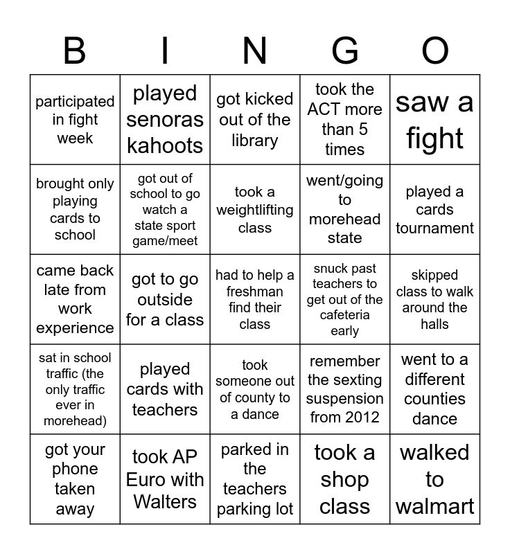 This bingo card has a free space and 24 words: played cards with teachers, took AP Euro with Walters, took a weightlifting class, got your phone taken away, saw a fight, participated in fight week, brought only playing cards to school, played senoras kahoots, snuck past teachers to get out of the cafeteria early, took someone out of county to a dance, went/going to morehead state, came back late from work experience, remember the sexting suspension from 2012, went to a different counties dance, got out of school to go watch a state sport game/meet, took a shop class, skipped class to walk around the halls, got kicked out of the library, played a cards tournament, got to go outside for a class, walked to walmart, sat in school traffic (the only traffic ever in morehead), took the ACT more than 5 times and parked in the teachers parking lot.