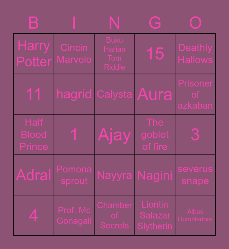 This bingo card has a free space and 24 words: Pomona sprout, Prof. Mc Gonagall, Calysta, 4, Deathly Hallows, Harry Potter, 11, Cincin Marvolo, The goblet of fire, Nayyra, Aura, Half Blood Prince, Nagini, severus snape, hagrid, Liontin Salazar Slytherin, 3, Buku Harian Tom Riddle, Prisoner of azkaban, 1, Albus Dumbledore, Adral, 15 and Chamber of Secrets.