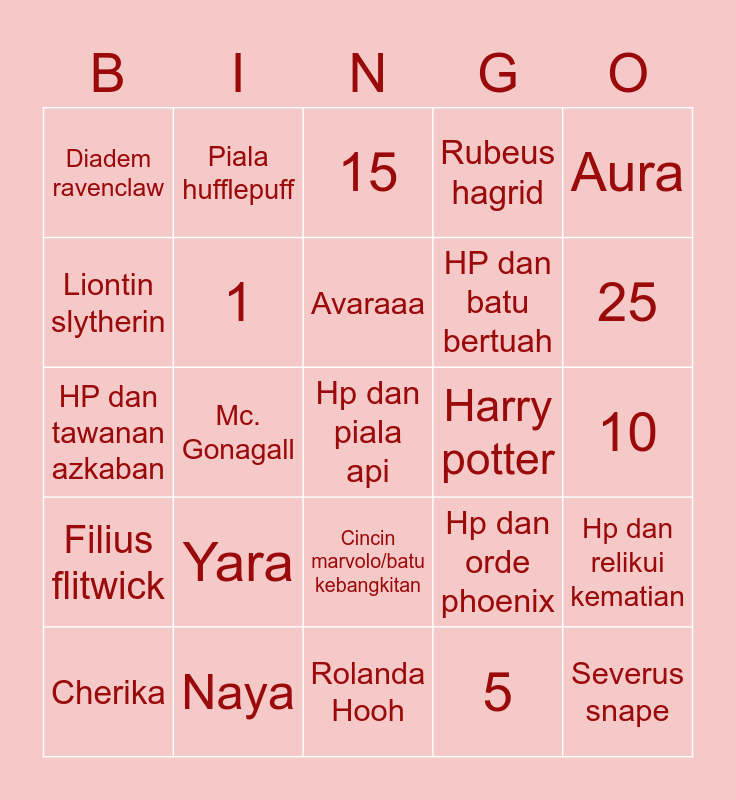 This bingo card has a free space and 24 words: Yara, Naya, Avaraaa, Cherika, Aura, Diadem ravenclaw, Liontin slytherin, Piala hufflepuff, Harry potter, Cincin marvolo/batu kebangkitan, HP dan batu bertuah, HP dan tawanan azkaban, Hp dan orde phoenix, Hp dan relikui kematian, 1, 5, 10, 15, 25, Mc. Gonagall, Severus snape, Filius flitwick, Rubeus hagrid and Rolanda Hooh.
