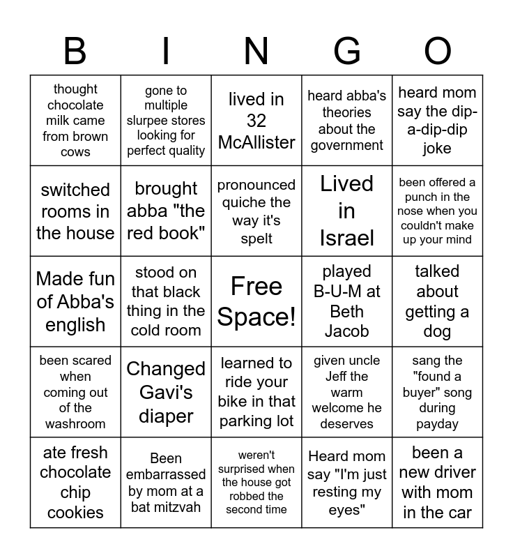 This bingo card has a free space and 24 words: Changed Gavi's diaper, Been embarrassed by mom at a bat mitzvah, pronounced quiche the way it's spelt, ate fresh chocolate chip cookies, heard mom say the dip-a-dip-dip joke, thought chocolate milk came from brown cows, switched rooms in the house, gone to multiple slurpee stores looking for perfect quality, played B-U-M at Beth Jacob, learned to ride your bike in that parking lot, Lived in Israel, Made fun of Abba's english, given uncle Jeff the warm welcome he deserves, sang the "found a buyer" song during payday, brought abba "the red book", Heard mom say "I'm just resting my eyes", talked about getting a dog, lived in 32 McAllister, been offered a punch in the nose when you couldn't make up your mind, stood on that black thing in the cold room, been a new driver with mom in the car, been scared when coming out of the washroom, heard abba's theories about the government and weren't surprised when the house got robbed the second time.
