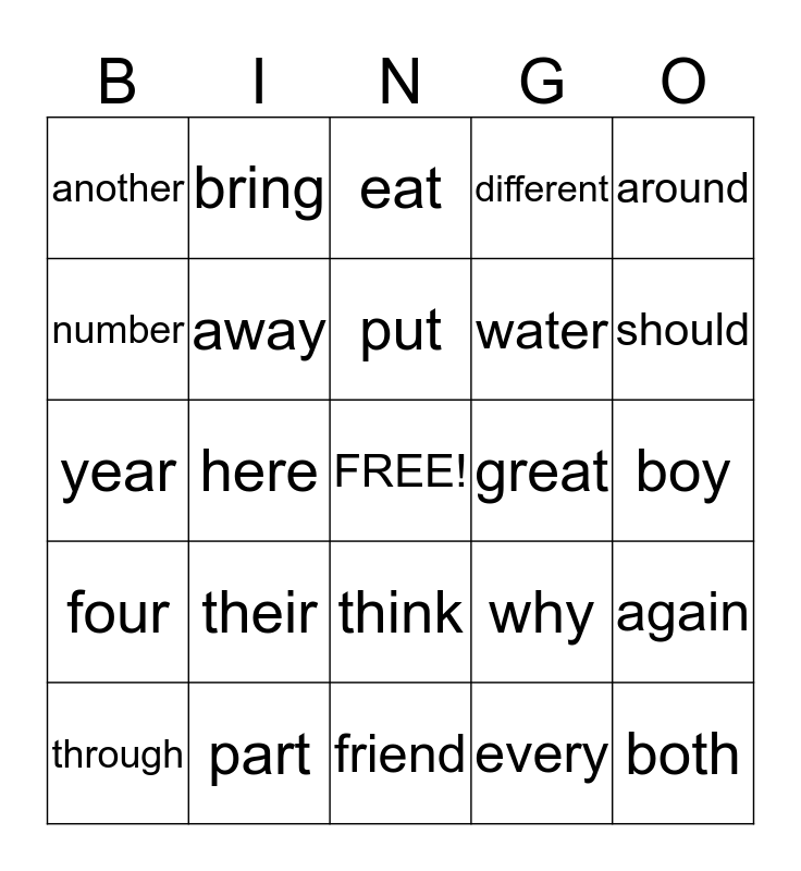This bingo card has a free space and 24 words: their, part, put, through, around, another, number, bring, great, think, water, year, why, again, away, every, boy, eat, should, here, both, four, different and friend.