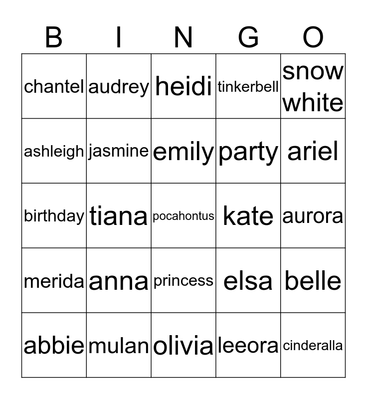 This bingo card has 25 words: anna, olivia, emily, abbie, snow white, chantel, ashleigh, audrey, kate, princess, party, birthday, elsa, belle, jasmine, cinderalla, aurora, heidi, ariel, tiana, pocahontus, mulan, merida, tinkerbell and leeora.