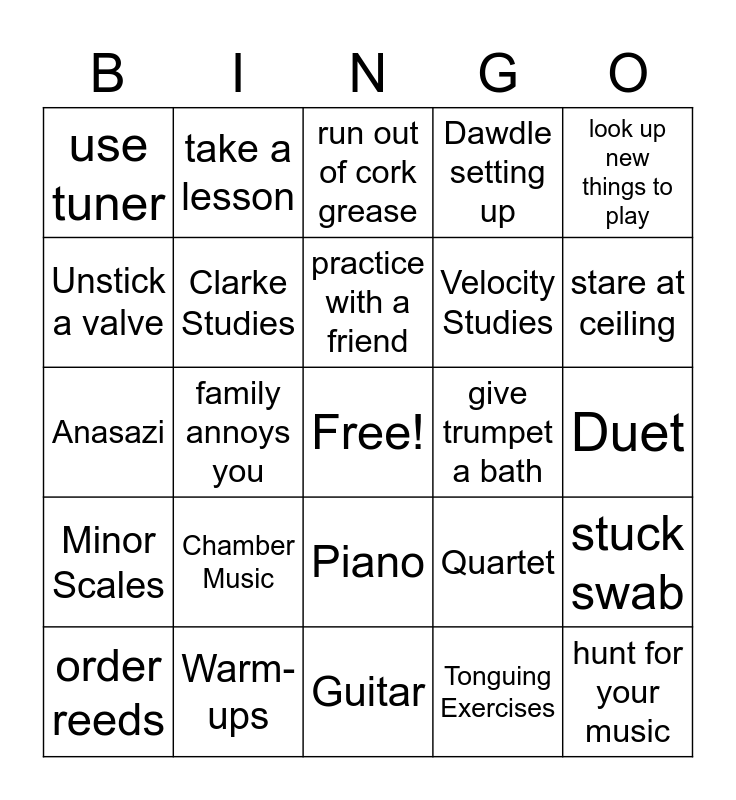 This bingo card has a free space and 60 words: Long Tones, Warm-ups, Major Scales, Minor Scales, Tonguing Exercises, Staccato Etudes, Clarke Studies, Rose Etudes, Velocity Studies, Practical Studies Volume 1, Dawdle setting up, Mess with a key, Unstick a valve, look at your phone, use metronome, use tuner, hunt for your music, look up new things to play, make a recording for teacher, practice with a friend, give trumpet a bath, run out of cork grease, order reeds, stuck swab, listen to a master on youtube, stand and stretch, tone color, tone quality, stare at ceiling, Annoy Family, Adjust lighting, Adjust seating, Clean mouthpiece, email teacher, take a lesson, compose an exercise, break a string, family annoys you, Invicta, Anasazi, Achilles Wrath, Chamber Music, Duet, Trio, Quartet, Solo, NYSSMA, Concert, Ukulele, Piano, Guitar, Clarinet, Flute, Trumpet, French Horn, Trombone, Tuba, Alto Sax, Tenor Sax and Percussion.