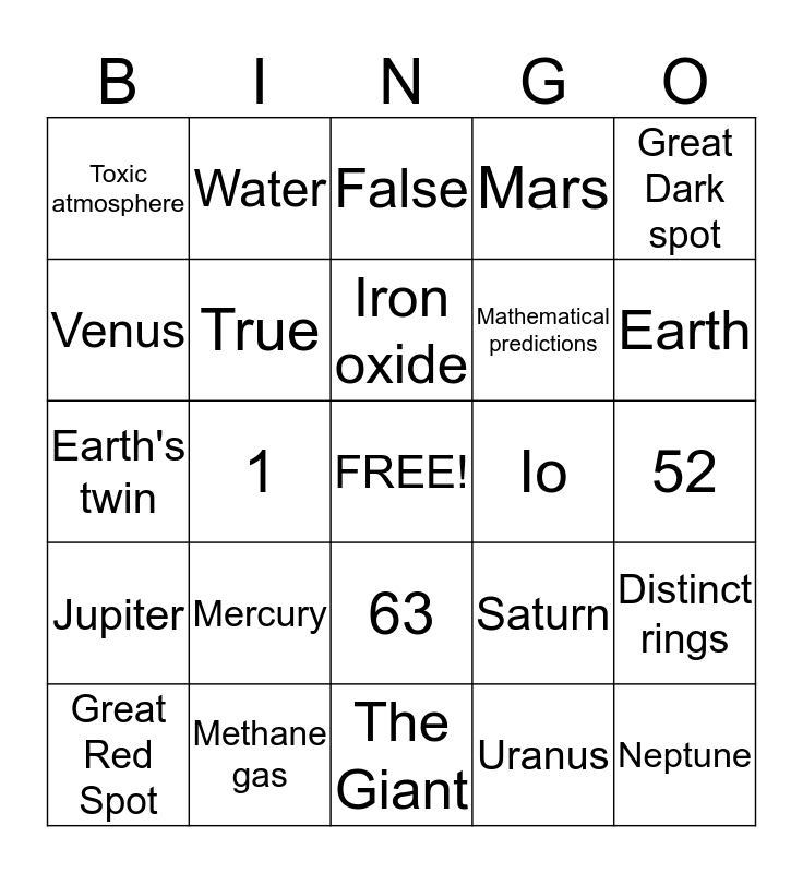 This bingo card has a free space and 24 words: Mercury, Methane gas, Iron oxide, Great Red Spot, Great Dark spot, Toxic atmosphere, Venus, Water, Io, 63, Mathematical predictions, Earth's twin, Saturn, Distinct rings, True, Uranus, 52, False, Earth, 1, Neptune, Jupiter, Mars and The Giant.