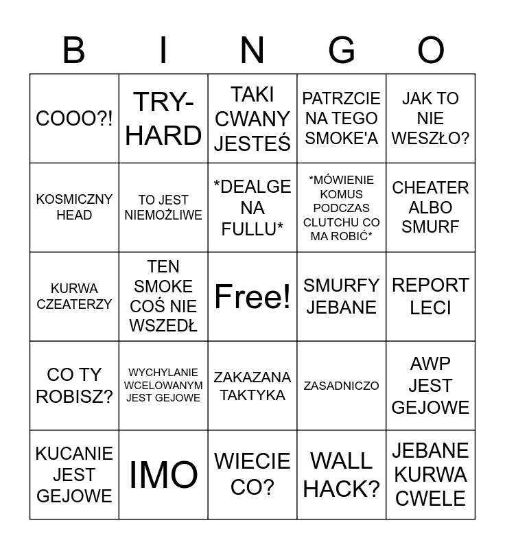 This bingo card has a free space and 24 words: WYCHYLANIE WCELOWANYM JEST GEJOWE, IMO, *DEALGE NA FULLU*, KUCANIE JEST GEJOWE, JAK TO NIE WESZŁO?, COOO?!, KOSMICZNY HEAD, TRY-HARD, SMURFY JEBANE, ZAKAZANA TAKTYKA, *MÓWIENIE KOMUS PODCZAS CLUTCHU CO MA ROBIĆ*, KURWA CZEATERZY, ZASADNICZO, AWP JEST GEJOWE, TO JEST NIEMOŻLIWE, WALL HACK?, REPORT LECI, TAKI CWANY JESTEŚ, CHEATER ALBO SMURF, TEN SMOKE COŚ NIE WSZEDŁ, JEBANE KURWA CWELE, CO TY ROBISZ?, PATRZCIE NA TEGO SMOKE'A and WIECIE CO?.