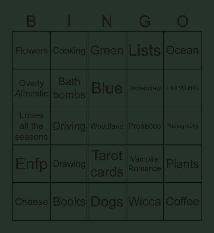 This bingo card has 25 words: Enfp, Books, Woodland, Wicca, Ocean, Flowers, Cooking, Green, Prosecco, Plants, Overly Altruistic, Bath bombs, Dogs, Vampire Romance, EMPATHIC, Cheese, Driving, Blue, Ravenclaw, Photography, Loves all the seasons, Drawing, Tarot cards, Lists and Coffee.
