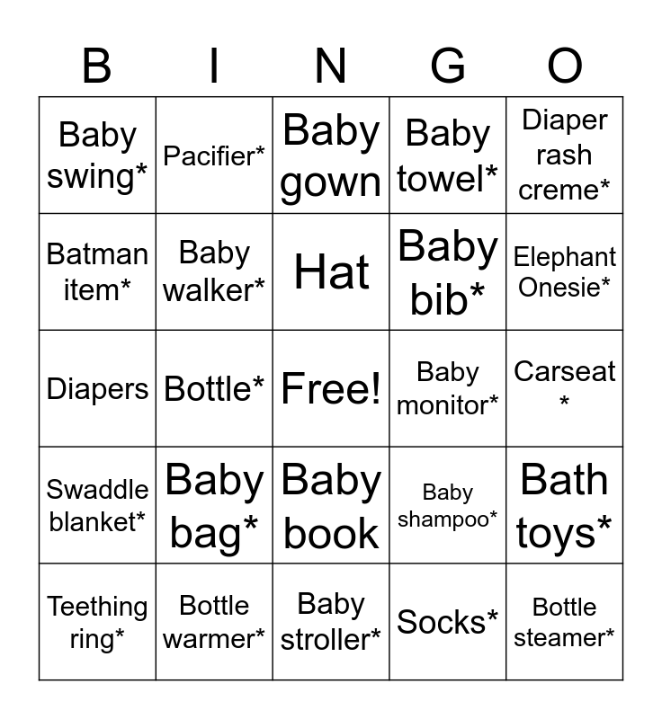 This bingo card has a free space and 30 words: Bottle warmer*, Bottle brush*, Bottle*, Bassinet*, Baby swing*, Baby gown, Baby walker*, Baby book, Baby monitor*, Baby stroller*, Carseat *, Bottle steamer*, Socks*, Mittens*, Elephant Onesie*, Baby tub*, Baby shampoo*, Swaddle blanket*, Baby bag*, Diaper rash creme*, Diapers, High chair*, Pacifier*, Baby bib*, Batman item*, Baby towel*, Bath toys*, Teething ring*, Hat and Burp cloth.