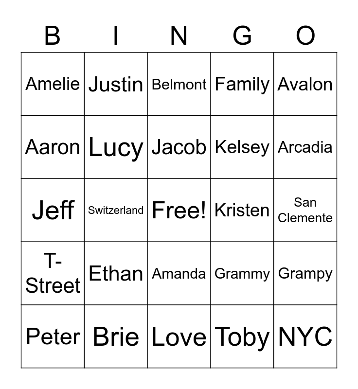This bingo card has a free space and 24 words: Ethan, Brie, Jacob, Peter, Avalon, Amelie, Aaron, Justin, Kristen, Amanda, Kelsey, Jeff, Grammy, Grampy, Lucy, Toby, San Clemente, Belmont, Arcadia, Switzerland, NYC, T-Street, Family and Love.