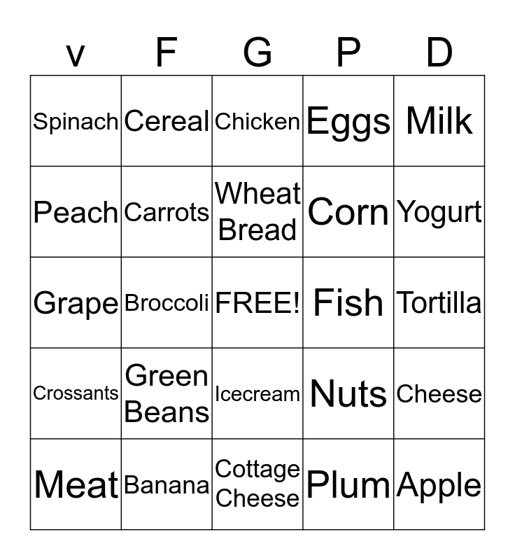 This bingo card has a free space and 24 words: Green Beans, Banana, Wheat Bread, Meat, Milk, Spinach, Peach, Cereal, Fish, Icecream, Corn, Grape, Nuts, Cheese, Carrots, Plum, Tortilla, Chicken, Yogurt, Broccoli, Apple, Crossants, Eggs and Cottage Cheese.