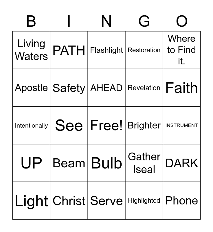 This bingo card has a free space and 29 words: Light, Spiritual Darkenss, See, SAINTS, Living Waters, Flashlight, Safety, Beam, Brighter, Christ, INSTRUMENT, Phone, Serve, Highlighted, Faith, 1,000 Watt, Bulb, UP, Where to Find it., Intentionally, Gather Iseal, Shine, Revelation, Apostle, Restoration, PATH, DARK, AHEAD and Focusing.
