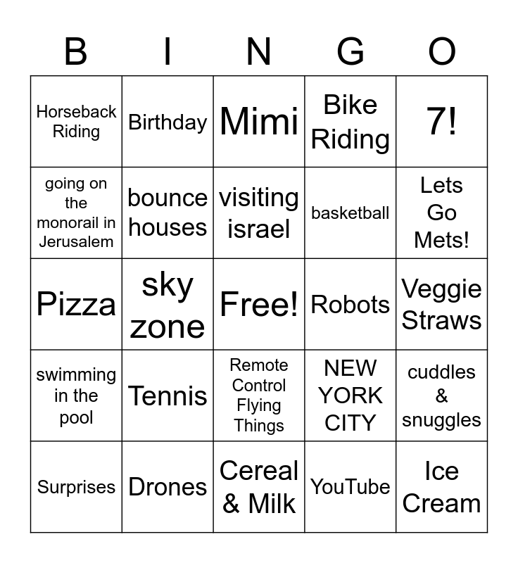 This bingo card has a free space and 44 words: Baseball, Ice Cream, Gifts, Surprises, Hot Wheels, YouTube, Mimi, Disney World, 7!, Drones, Bike Riding, Robots, Remote Control Flying Things, Tennis, Zip-lining, Cereal & Milk, Football, Pizza, iPads, Lets Go Mets!, Birthday, Going to Mets Games, Leora, Horseback Riding, Peanut Butter Sandwiches, Veggie Straws, foot races, winning, NEW YORK CITY, swimming in the pool, playing with Mimi & Leora, cuddles & snuggles, playing with friends, movies, sky zone, bronx zoo, getting a dog, snorkeling, visiting israel, going on the monorail in Jerusalem, basketball, matza pizza year round, bounce houses and waterparks.