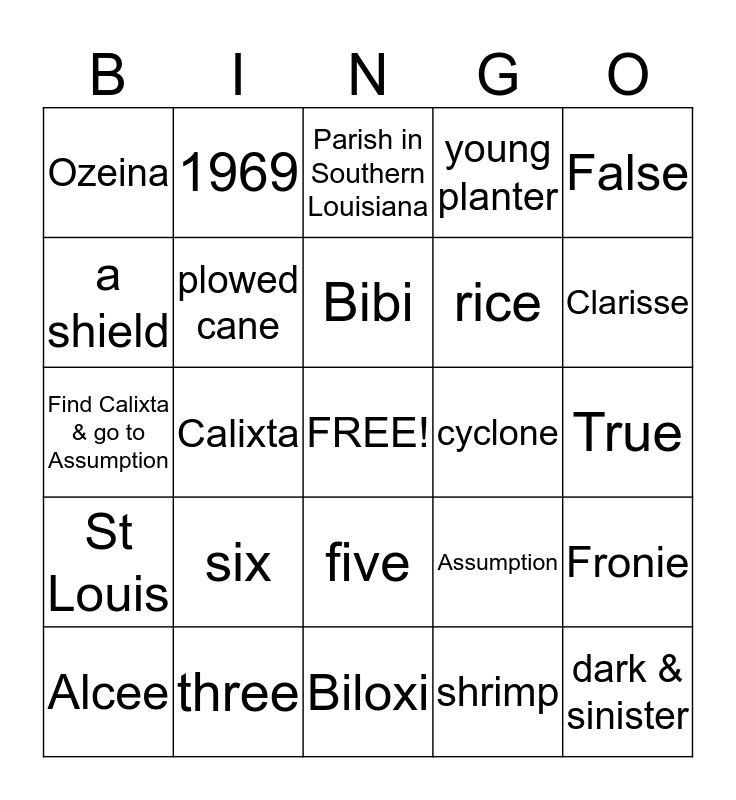 This bingo card has a free space and 24 words: six, three, Bibi, Alcee, False, Ozeina, a shield, 1969, cyclone, five, rice, Find Calixta & go to Assumption, Assumption, Fronie, plowed cane, shrimp, True, Parish in Southern Louisiana, Clarisse, Calixta, dark & sinister, St Louis, young planter and Biloxi.