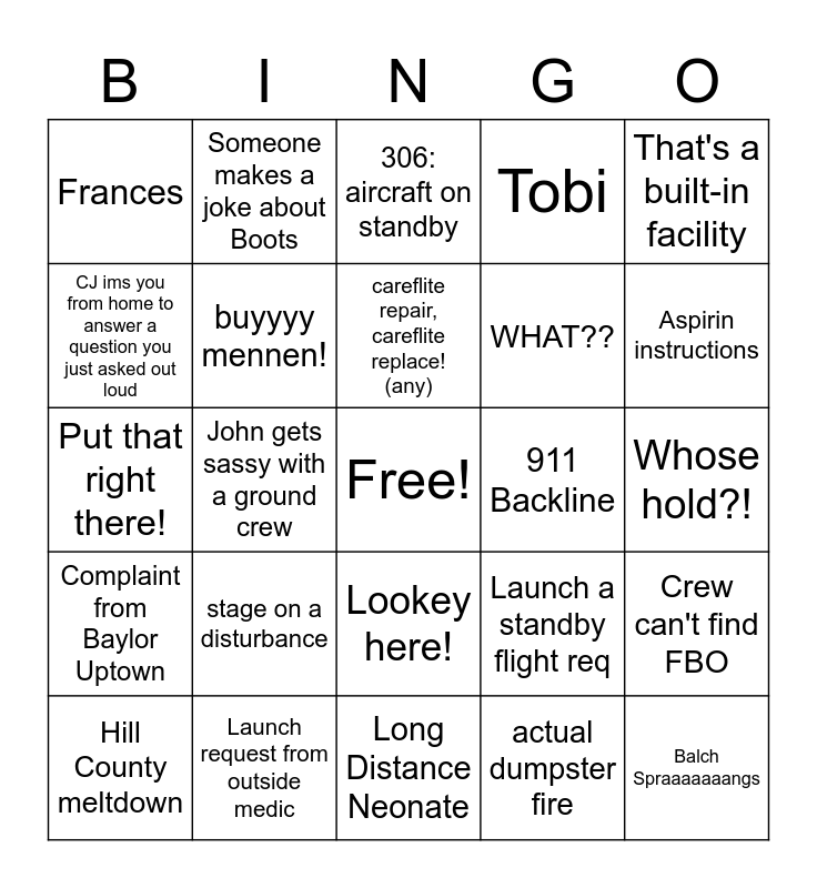 This bingo card has a free space and 79 words: Nelson from CC Young, This is John at CareFlite Communications in Grand Prairie Texas, 306: aircraft on standby, Roll Call, Fixed wing request, TRAUMA RAC, JQ sleeps thru a call, barricaded subject, incoherent caller won't stop talking, person calls to complain every 30 min for the rest of shift, launch a bird, Reuben, Tobi, Frances, Greta van Fleet / ground report, CJ ims you from home to answer a question you just asked out loud, Rude! (Jessica), stage on a disturbance, kenneth copeland vortex, Whose hold?!, HELLO! (moviefone voice), That's a built-in facility, Put that right there!, careflite repair, careflite replace! (any), buyyyy mennen!, Air Evac on a recorded line, Robin makes you call Eagle Mtn, Transfer to John's mom's house, ORGAN HARVEST, You have to call FD for lift assist, Aspirin instructions, Neonate call, Long Distance Neonate, This is Lori Tittle house supervisor Palp Pinto General Hospital Mineral Wells Texas, Hill County meltdown, 911 Backline, 911 Blind Transfer, No Code No Fire, Inmate call!, Balch Spraaaaaaangs, Get put on hold in the middle of a res, seveneleven, Crew times out after 8+ hrs down, Irate 911 caller, spell T-H-A-T / repeat "THAT", Someone makes a joke about Boots, You are first to timestamp, confirmed COVID positive, Finger guns!!!, Someone yells Dumpster Fire!!!, Crew can't find FBO, John gets sassy with a ground crew, Launch a standby flight req, Impella/ECMO/balloon pump...but by ground, You have to play loss prevention, Hung up on by 911 caller, HOT TAKE, You finish sudoku and yell "caw caw!", You gonna get sa-sa / Sa-sa him!, Lookey here!, WHAT??, Missing Paperwork, KYEEMP!, DesoTOH, We're good., No chez., "2 on Dallas!", Fire Structure!, "Meow…meow…meow" during breathing verification tool, Complaint from Baylor Uptown, Launch request from outside medic, RRRRRrrrog, CURB IT, Prrretty good mission, "right meow" on the radio, actual dumpster fire, "621 on tones", transplant surgeon requests stretch escalade w/ hot tub and light bar to take him from highland park to methodist dallas and BYEEeeee.