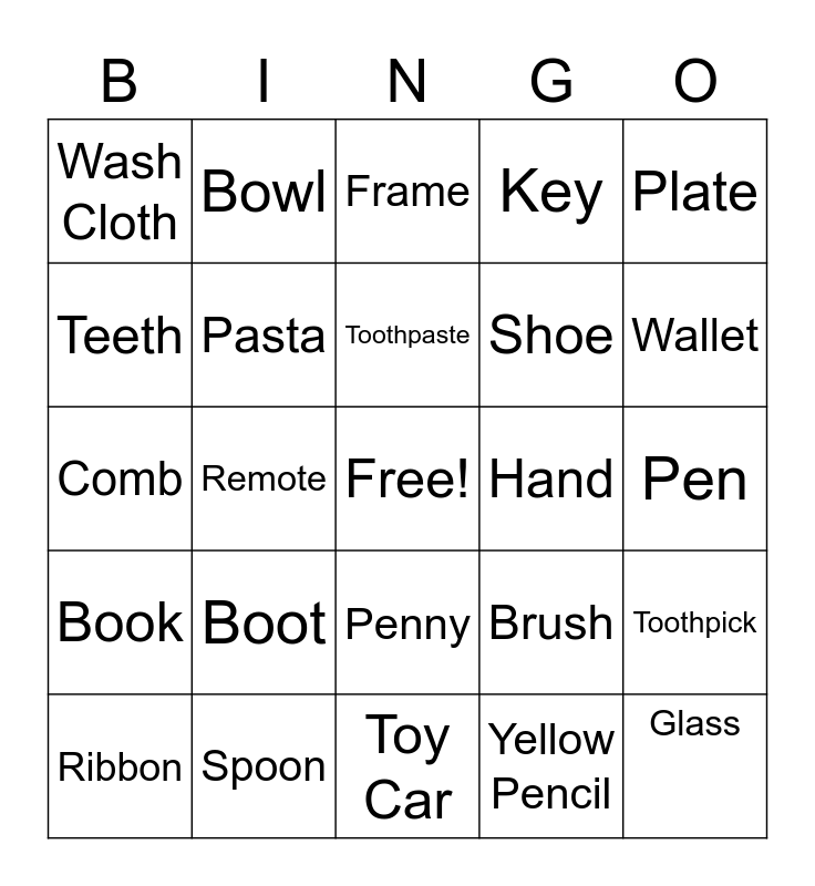 This bingo card has a free space and 24 words: Boot, Spoon, Toothpaste, Ribbon, Plate, Wash Cloth, Teeth, Bowl, Hand, Penny, Shoe, Comb, Brush, Toothpick, Pasta, Yellow Pencil, Pen, Frame, Wallet, Remote, Glass, Book, Key and Toy Car.