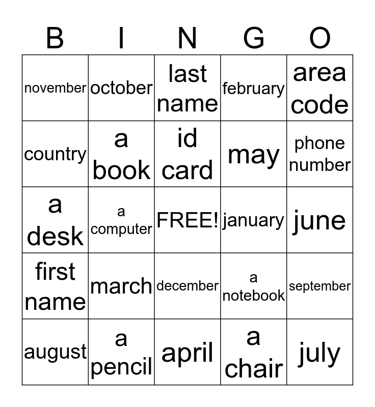 This bingo card has a free space and 24 words: march, a pencil, id card, august, area code, november, country, october, january, december, may, a desk, a notebook, september, a book, a chair, june, last name, phone number, a computer, july, first name, february and april.
