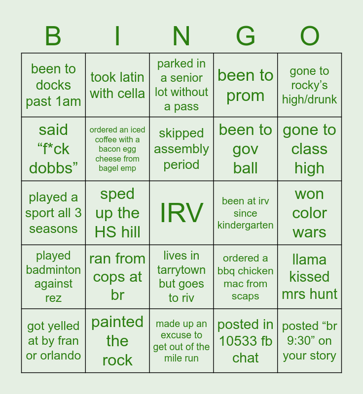 This bingo card has a free space and 24 words: ran from cops at br, painted the rock, skipped assembly period, got yelled at by fran or orlando, gone to rocky’s high/drunk, been to docks past 1am, said “f*ck dobbs”, took latin with cella, been at irv since kindergarten, lives in tarrytown but goes to riv, been to gov ball, played a sport all 3 seasons, ordered a bbq chicken mac from scaps, llama kissed mrs hunt, ordered an iced coffee with a bacon egg cheese from bagel emp, posted in 10533 fb chat, won color wars, parked in a senior lot without a pass, gone to class high, sped up the HS hill, posted “br 9:30” on your story, played badminton against rez, been to prom and made up an excuse to get out of the mile run.