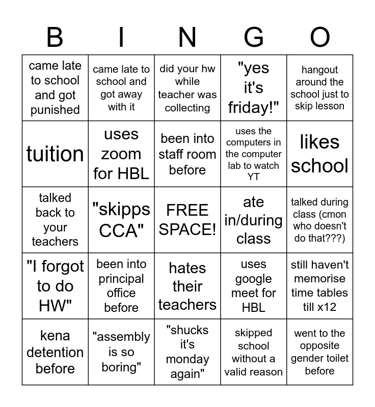 This bingo card has a free space and 24 words: kena detention before, been into principal office before, been into staff room before, skipped school without a valid reason, hangout around the school just to skip lesson, came late to school and got punished, came late to school and got away with it, did your hw while teacher was collecting, ate in/during class, talked during class (cmon who doesn't do that???), talked back to your teachers, uses zoom for HBL, uses google meet for HBL, still haven't memorise time tables till x12, tuition, "assembly is so boring", "shucks it's monday again", "yes it's friday!", likes school, "I forgot to do HW", "skipps CCA", hates their teachers, uses the computers in the computer lab to watch YT and went to the opposite gender toilet before.