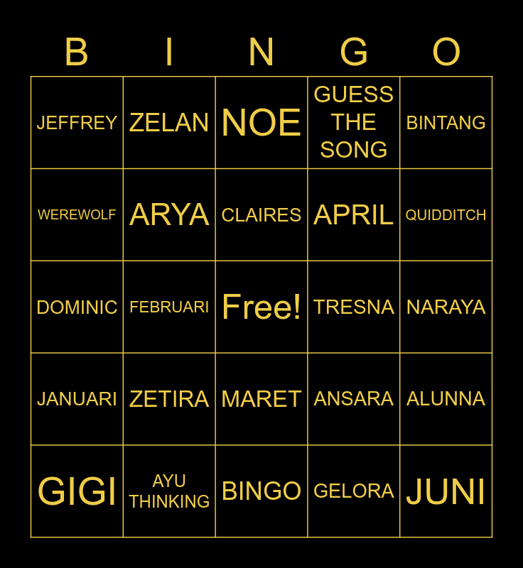 This bingo card has a free space and 24 words: GIGI, ZETIRA, CLAIRES, GELORA, BINTANG, JEFFREY, ZELAN, NOE, TRESNA, NARAYA, DOMINIC, ARYA, ANSARA, ALUNNA, WEREWOLF, AYU THINKING, BINGO, GUESS THE SONG, QUIDDITCH, JANUARI, FEBRUARI, MARET, APRIL and JUNI.