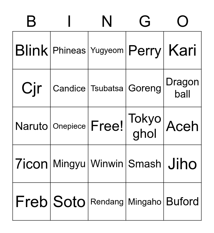This bingo card has a free space and 24 words: Mingyu, Soto, Tsubatsa, Freb, Kari, Blink, Cjr, Phineas, Tokyo ghol, Winwin, Goreng, Naruto, Smash, Jiho, Candice, Mingaho, Aceh, Yugyeom, Dragon ball, Onepiece, Buford, 7icon, Perry and Rendang.