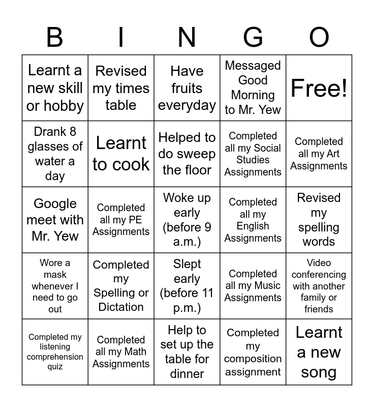 This bingo card has a free space and 24 words: Completed my Spelling or Dictation, Completed all my Math Assignments, Helped to do sweep the floor, Completed my listening comprehension quiz, Free!, Learnt a new skill or hobby, Drank 8 glasses of water a day, Revised my times table, Completed all my English Assignments, Slept early (before 11 p.m.), Completed all my Social Studies Assignments, Google meet with Mr. Yew, Completed all my Music Assignments, Video conferencing with another family or friends, Learnt to cook, Completed my composition assignment, Revised my spelling words, Have fruits everyday, Completed all my Art Assignments, Completed all my PE Assignments, Learnt a new song, Wore a mask whenever I need to go out, Messaged Good Morning to Mr. Yew and Help to set up the table for dinner.